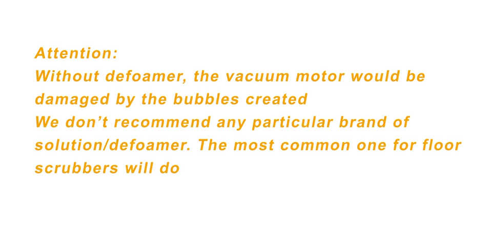 Item Name Parameter Power21SP Brush Width in 21 Squeegee Width in 31.5 Working Time H 3-5 Battery ah 100*2 Voltage V 24 = 2*12 Solution Tank Gal 12 Recovery Tank Gal 13 Brush Rotation rpm 175 Efficiency sq. ft/h 36,500 Vacuum Motor Power HP 0.4 Brush Motor Power HP 0.74 Traction Motor Power HP 0.13 Pad Pressure lb 80 Machine Weight lb 338 Machine with Package Weight lb 430 L x W x Ht (machine) in 55*32.5*41 L x W x Ht (Package) in 57*27*54 You can clean the floor with clean water. If the floor is greasy or sticky, you can add solution to the solution tank (lower tank) while adding defoamer/anti-foam in the recovery tank (upper tank) or the vacuum motor might be damaged and warranty voided.